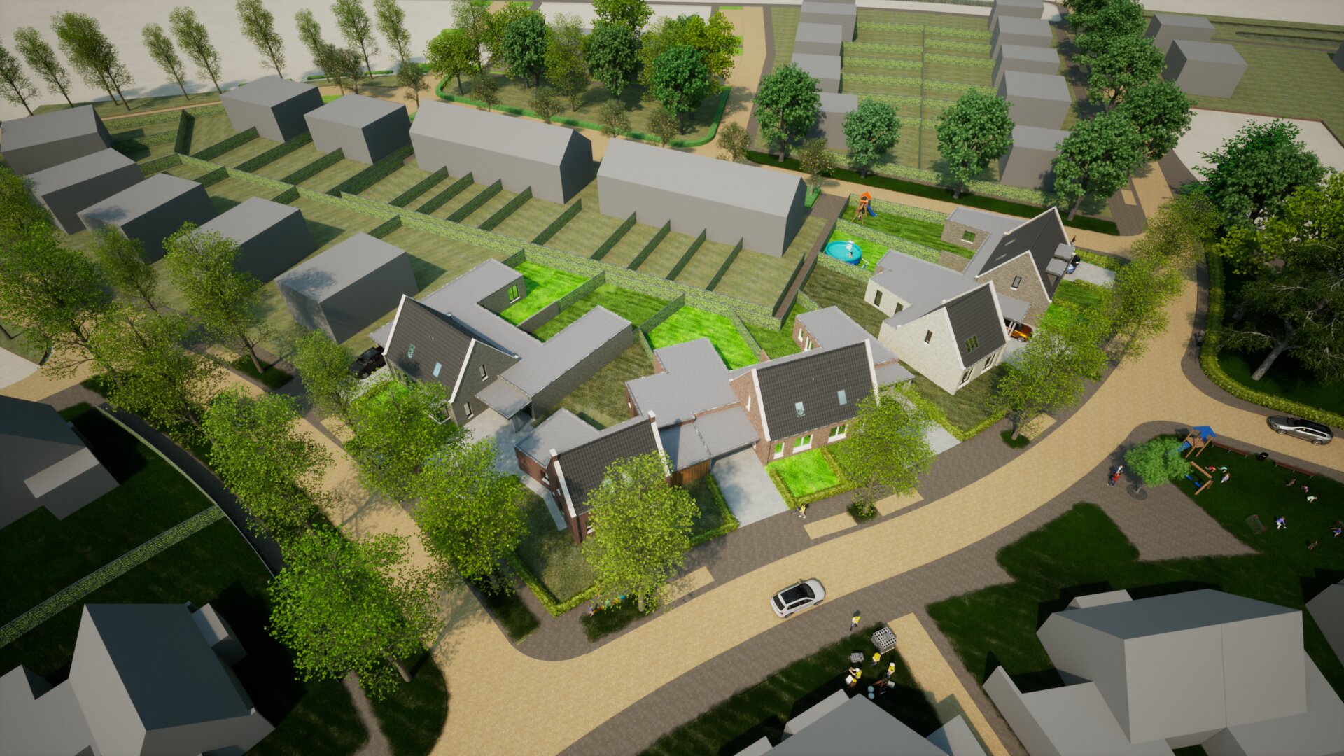 Er wordt rekening gehouden met het realiseren van energiezuinige woningen op basis van de BENG-normen. Hierbij kun je denken aan goede isolatie, een luchtwarmtepomp, vloerverwarming, een WTW-ventilatiesysteem en zonnepanelen. Er is geen gasaansluiting aangebracht, de woningen zijn volledig elektrisch!